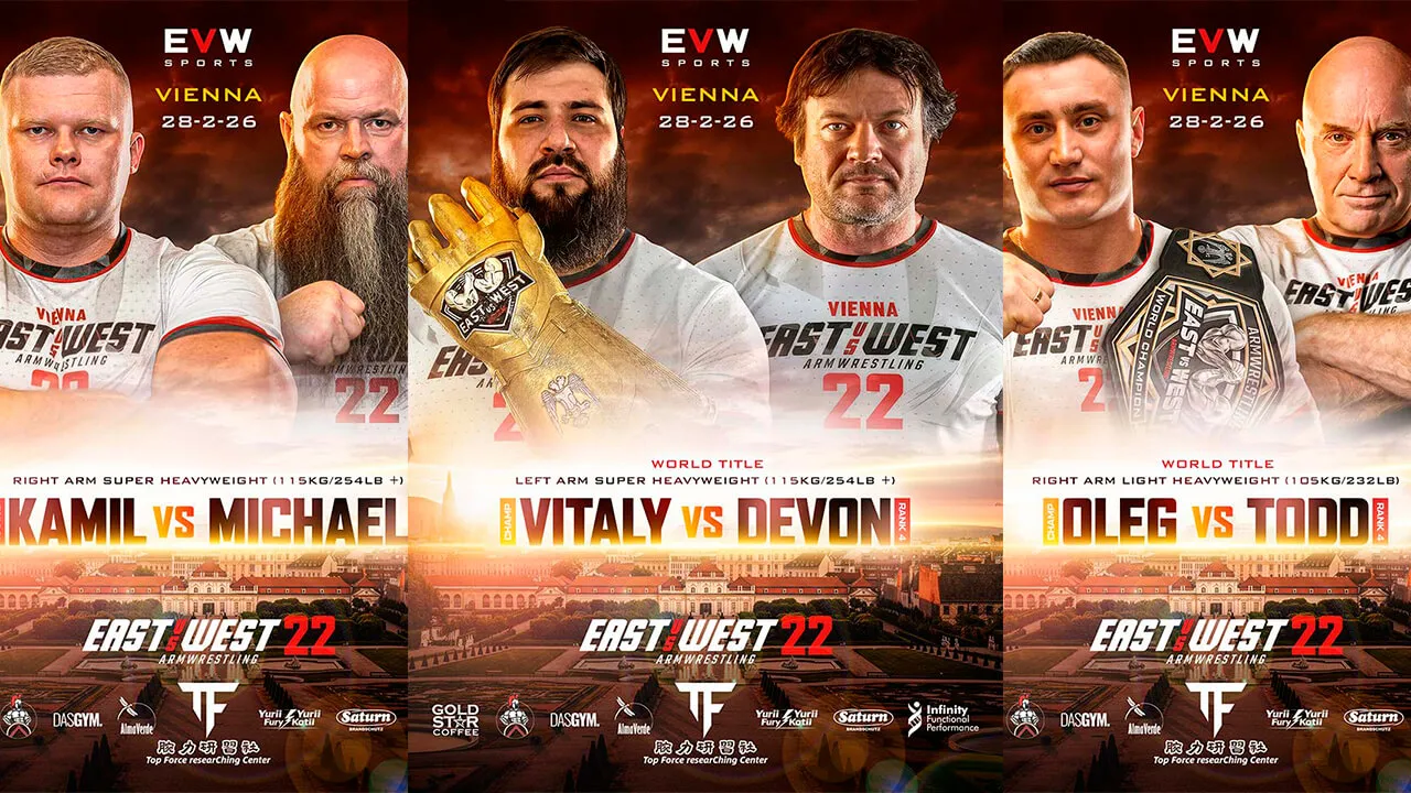Результаты турнира East vs West 22. Кто выиграл в главном армфайте вечера — Виталий Лалетин или Девон Ларратт? Смог ли Майкл Тодд противостоять Камилу Яблоньски на правой руке? Чем завершилось противостояние Олега Петренко и Тодда Хатчингса? А также все итоги поединков главного армрестлинг события зимы, прошедшего в Вене.