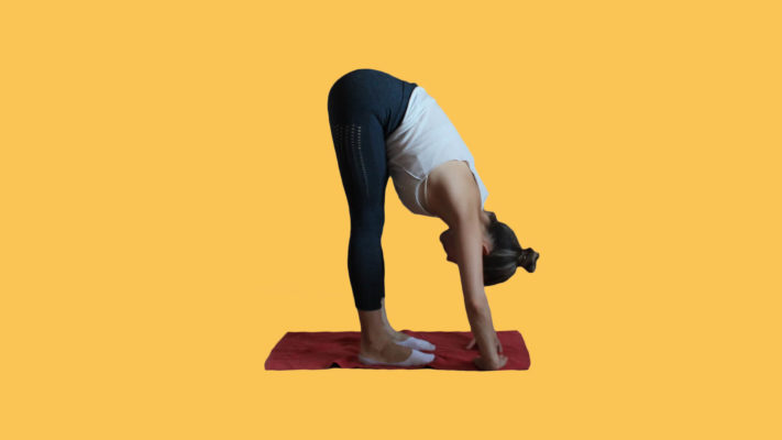 Упражнение предназначено для расслабления спины и мышц задней поверхности бедра. Поставьте стопы по ширине таза и наклоните туловище вперед. Возьмитесь руками за голени, дополнительно можно усилить вытяжение, подтягивая руками туловище к бедрам. После выполнения вставайте медленно с круглой спиной.
